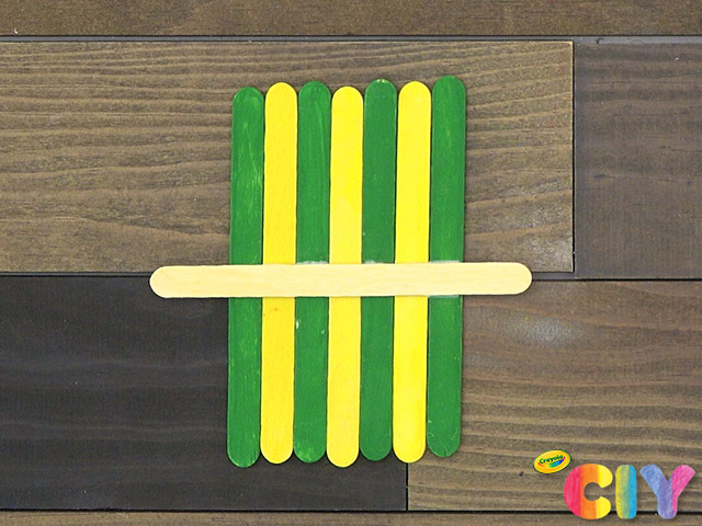 Line up painted popsicle sticks side by side. Glue unpainted popsicle stick across the middle to hold sticks together and create base for monster arms.