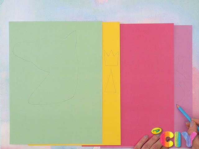 Sketch unicorn head, unicorn horn, crown, dress, and gloves on cardstock. Cut out.