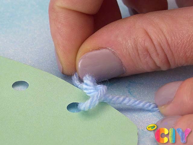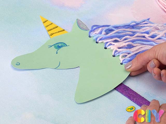 Loop yarn through hole punches and knot to create unicorn hair.