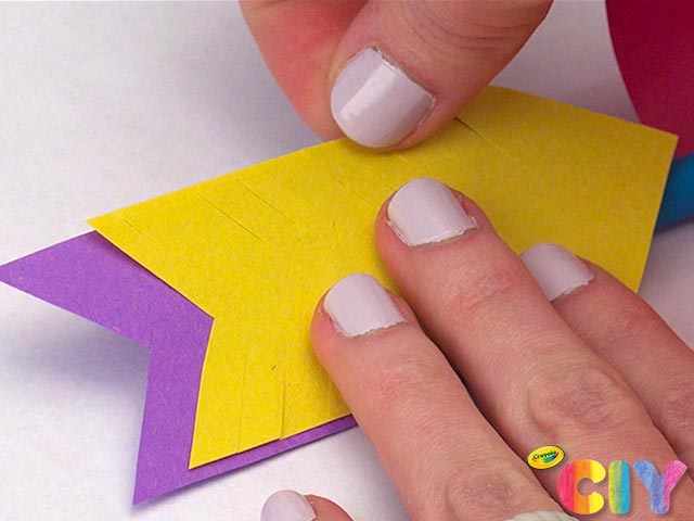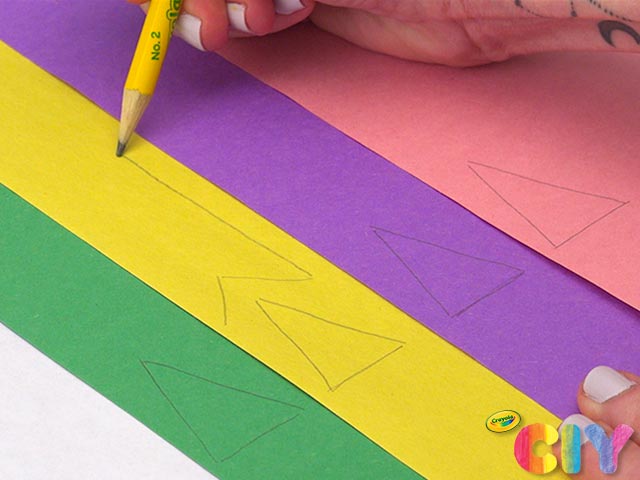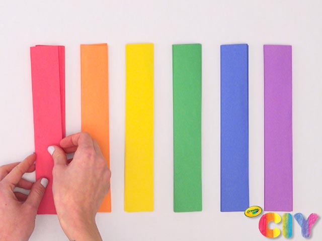 Cut out 24 red, 28 orange, 20 yellow, 16 green, 28 blue, and 28 purple construction paper strips measuring approximately 6”H x 2”W.