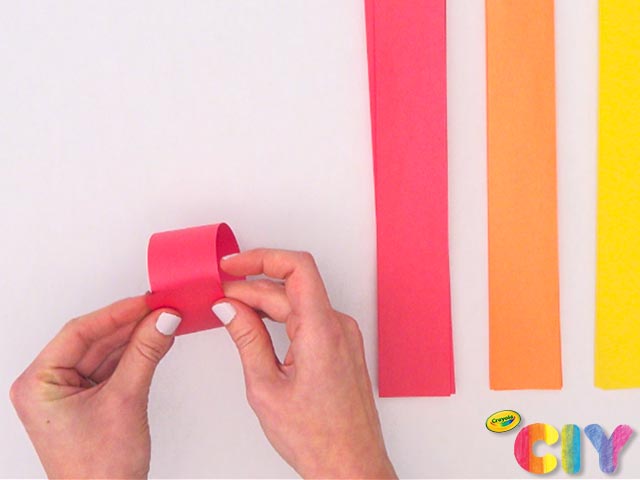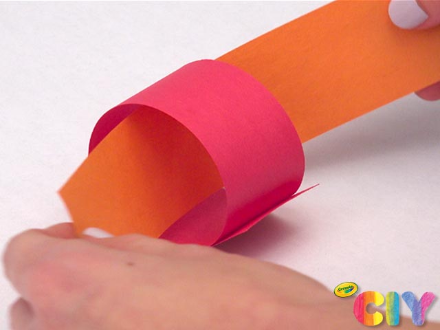 Add glue to end of orange paper strip. Place orange strip through red loop and roll to create interconnected loops.