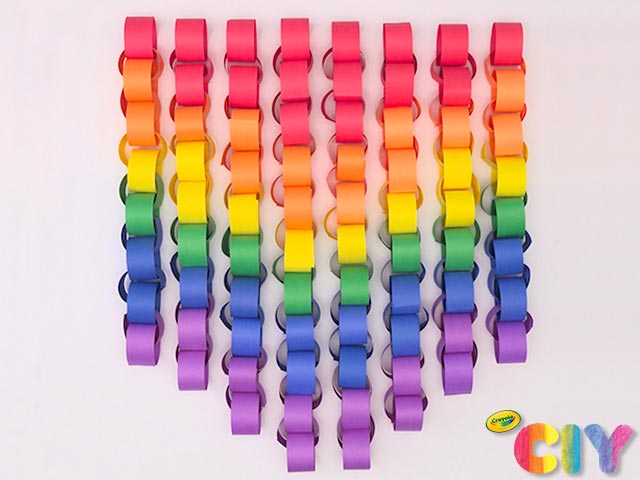 Download or print Rainbow Paper Chain Mural Color Instructions (see Supplies or CIY Staff Tips). Repeat step 3 for color sequences outlined in instructions to complete paper chains.