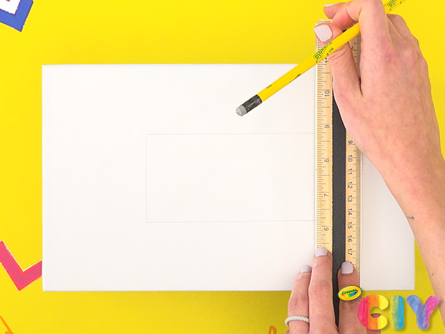 Use ruler to sketch small rectangle in middle of shoebox lid.