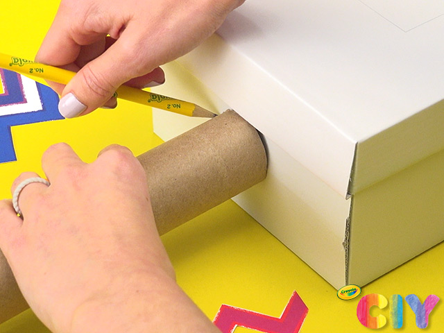 Place paper towel roll against side of shoebox and trace with pencil.