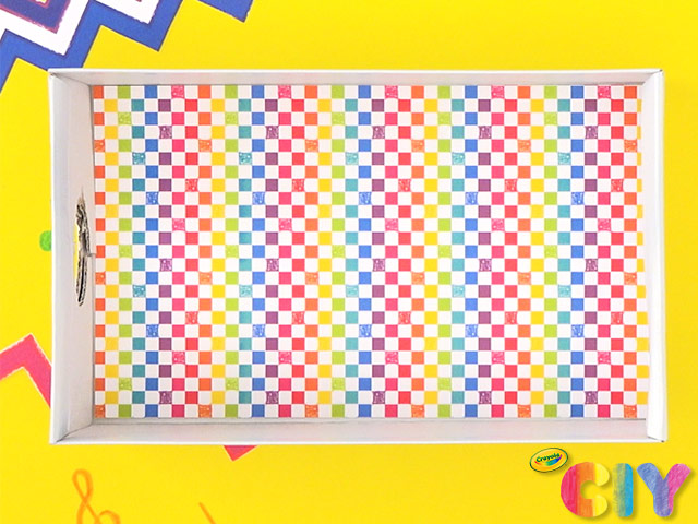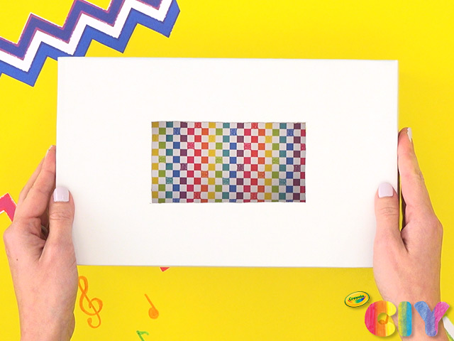 Cut out cardstock pieces and glue colorful designs to box.