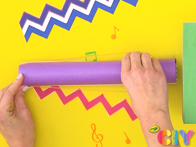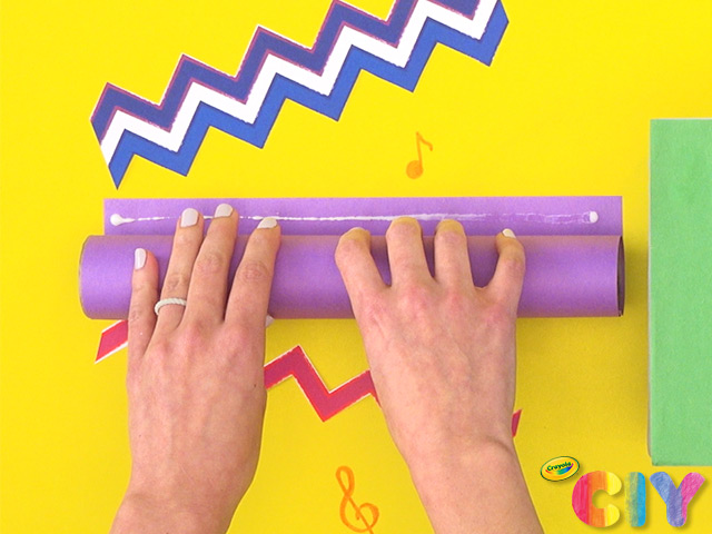 Add glue to top and bottom of piece of construction paper. Place paper towel roll on glue and roll to secure paper. Let all glue steps dry 1–2 hours.