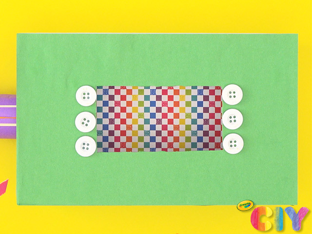 Ask an adult to hot glue 3 buttons on both sides of rectangular opening. Cool 15 minutes.