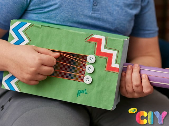 Just keep strumming! Kids can play pretend & create this shoebox craft with rubber band guitar strings.