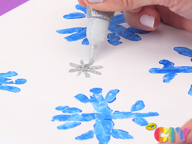 Add sparkly snowflake details with glitter glue. Dry all paint and glitter glue steps 3–4 hours.
