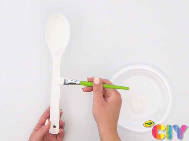 Cover spoon in white paint. Dry 1–2 hours. Add second coat of paint. Dry 1–2 hours.