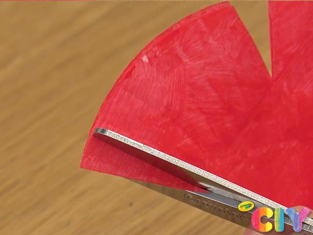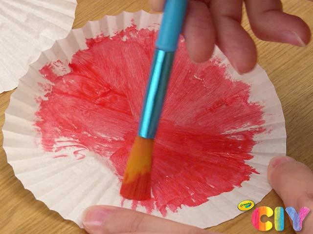 Flatten and cover 2 cupcake liners with red paint. Dry 1–2 hours. Flip and cover with red paint. Dry 1–2 hours.