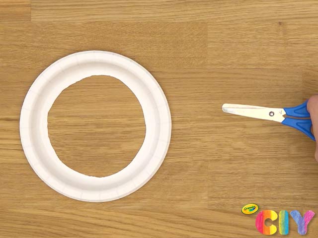 Cut piece of construction paper 1”H and use width of paper plate as guide for length. Glue to front of paper plate, then flip upside down.