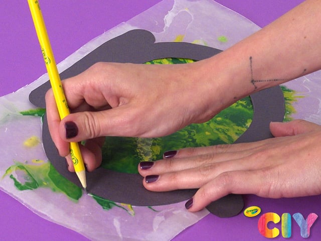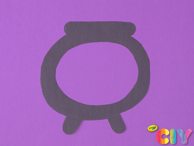 Draw outline of a cauldron on construction paper, plus inner circle. Cut out both.