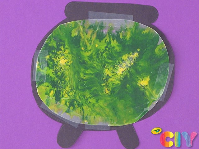Attach wax paper to back of cauldron with clear tape and flip over.
