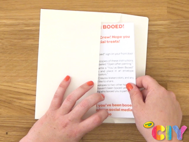 Using a white Crayola Crayon, write secret “You’ve Been Booed” message on cardstock.