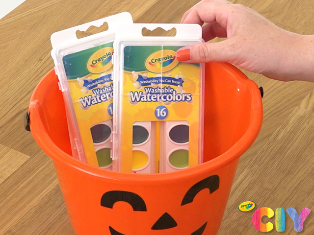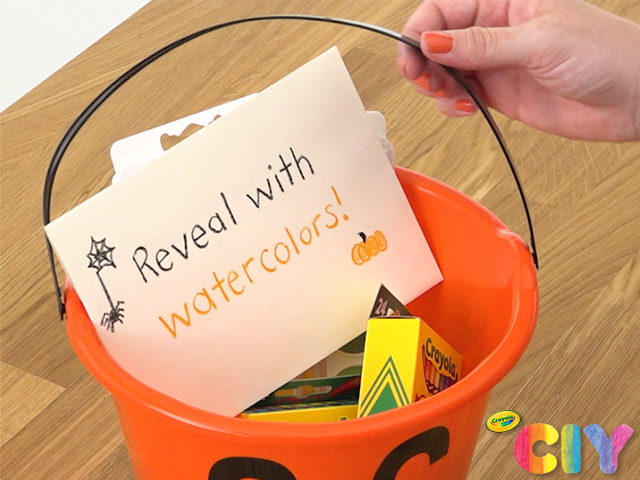 Place both envelopes, Crayola Crayons, Crayola Watercolors, and any other Halloween treats in bucket or basket.