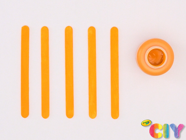 Cover 5 craft sticks with paint. Dry 1–2 hours. Add second coat. Dry 1–2 hours.