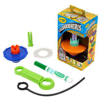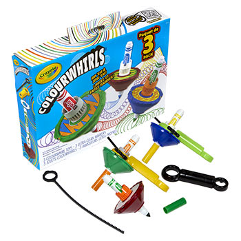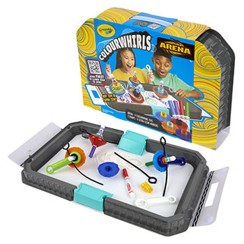 Crayola Colourwhirls Arena is a whirlwind of creativity and competition that includes 4 Colourwhirl toys and a spacious arena with a reusable surface that wipes clean.