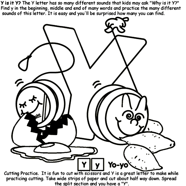 The letter Y has so many sounds in common with other letters that kids may ask "Why is it Y?" Find Y in the beginnings, middles and ends of many words and practice the many different sounds of this letter. Y Practice Cutting?