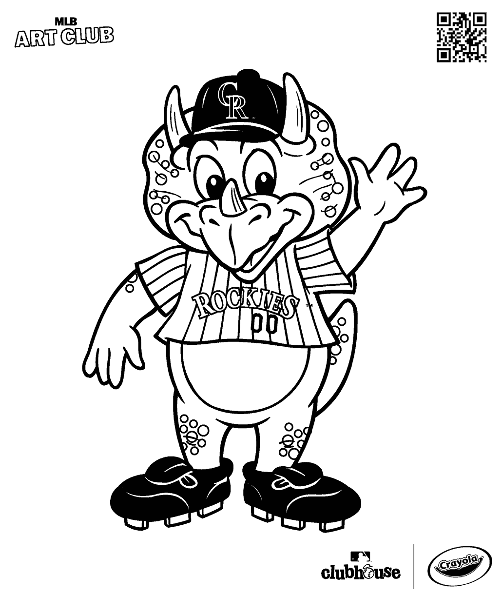 Dinger the Dinosaur coloring page with the Rockies mascot throwing a baseball! Perfect for kids who love animals and baseball.  There's more to explore at MLB Clubhouse!
