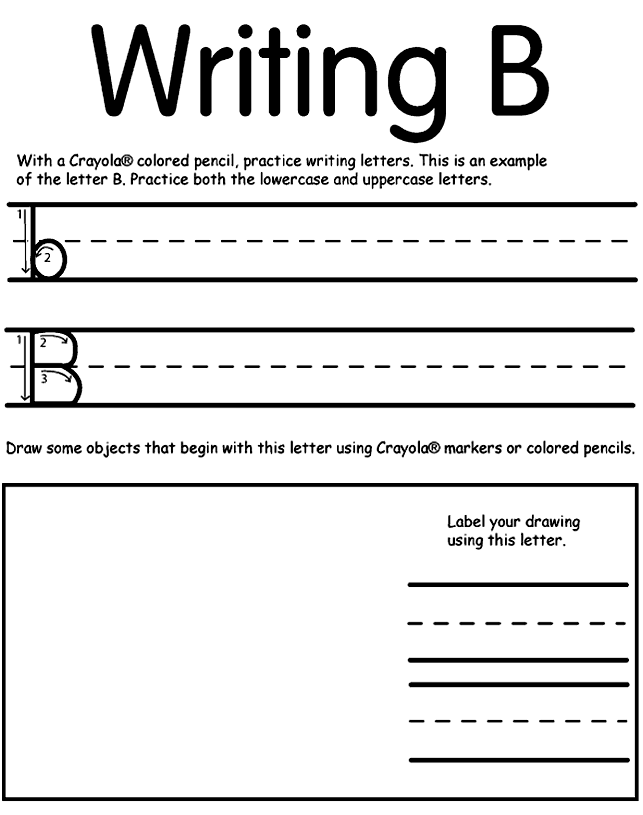 Use a Crayola® colored pencil to practice writing letters. This page shows an example of the letter B. Practice writing both the lowercase and uppercase letters. Can you draw some objects that begin with this letter? Draw the picture in the box, and then label it in the lines provided.