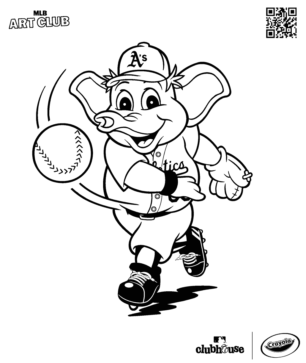 Stomper the Elephant coloring page with the Athletics mascot throwing a baseball! Perfect for kids who love animals and baseball. There's more to explore at MLB Clubhouse!