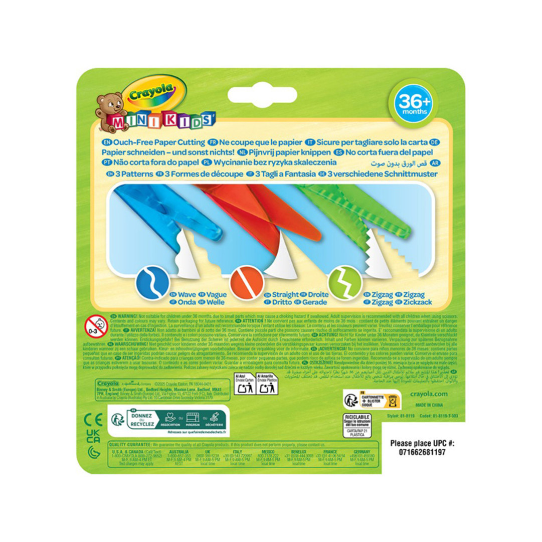 • Crayola Mini Kids è la linea di strumenti creativi appositamente studiata per bambini in età prescolare. Tanti prodotti concepiti per accompagnare i più piccoli in ogni specifico stadio del loro sviluppo creativo e adatti alle loro esigenze. Pennarelli con la punta arrotondata di sicurezza, pastelli a cera con il fusto triangolare, tempere a dita lavabili e sicure e tanti altri prodotti che accontenteranno i piccoli ma anche mamma e papà. Questo set contiene 3 forbici di sicurezza che tagliano solo carta e cartoncino. 3 tipi di taglio fantasia: dritto, zig zag, onda. Aiutano a sviluppare la coordinazione visivo manuale.