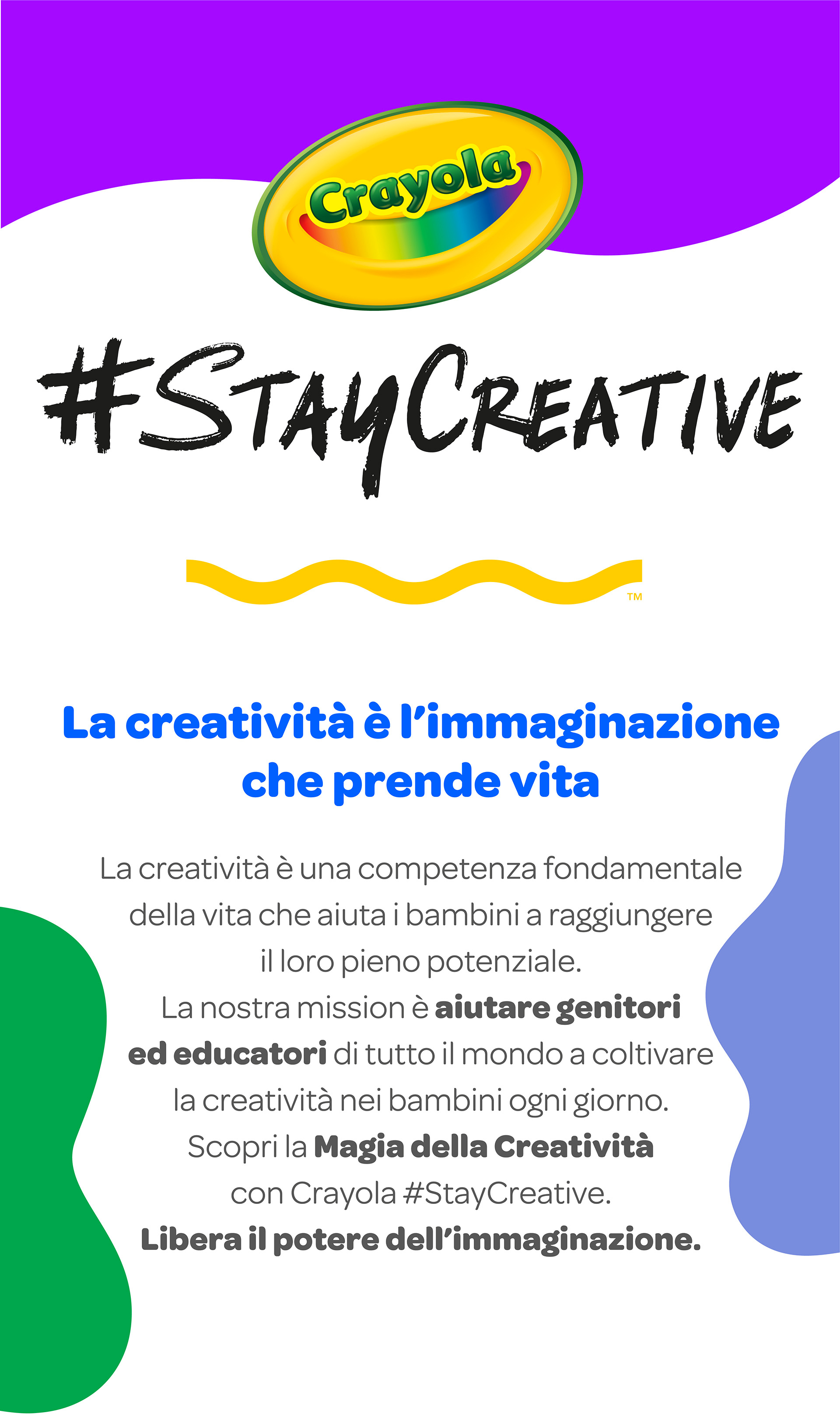 Noi di Crayola crediamo che la creatività sia fondamentale nello sviluppo dell’infanzia: rafforza la capacità di risolvere problemi, stimola la curiosità, educa alla flessibilità e aiuta a costruire fiducia in sé stessi.