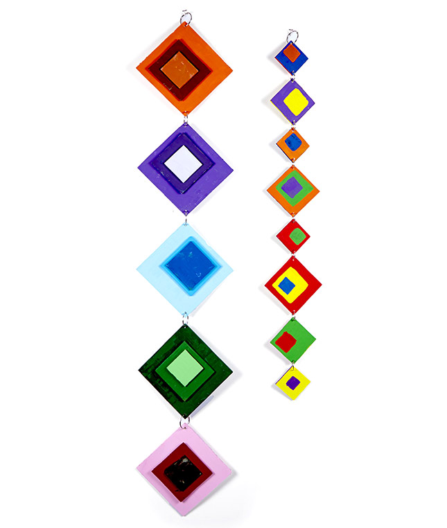 When the squares are dry, have them glue smaller squares on top of larger squares in the style of Albers. Help the students put small holes in the squares and connect them with small rings.