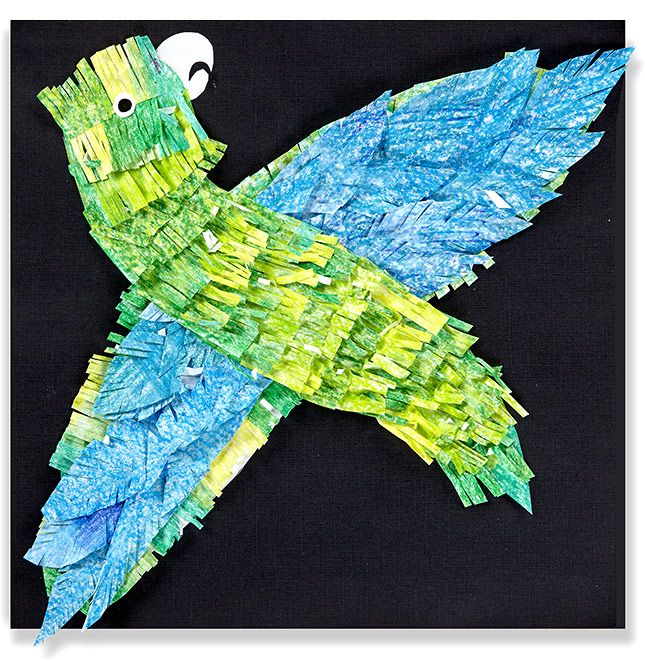 Have students choose a type of parrot to depict in a textured collage. They can draw the parrot's body on one piece of heavy paper and the two wings on another. They can outline and cut out the parrot's curved beak on a portion of the heavy paper. Next, they can color light construction paper using various colors that represent their chosen parrot, then cut these into strips. Additionally, they can cut slits into these strips to give it a feathery effect.