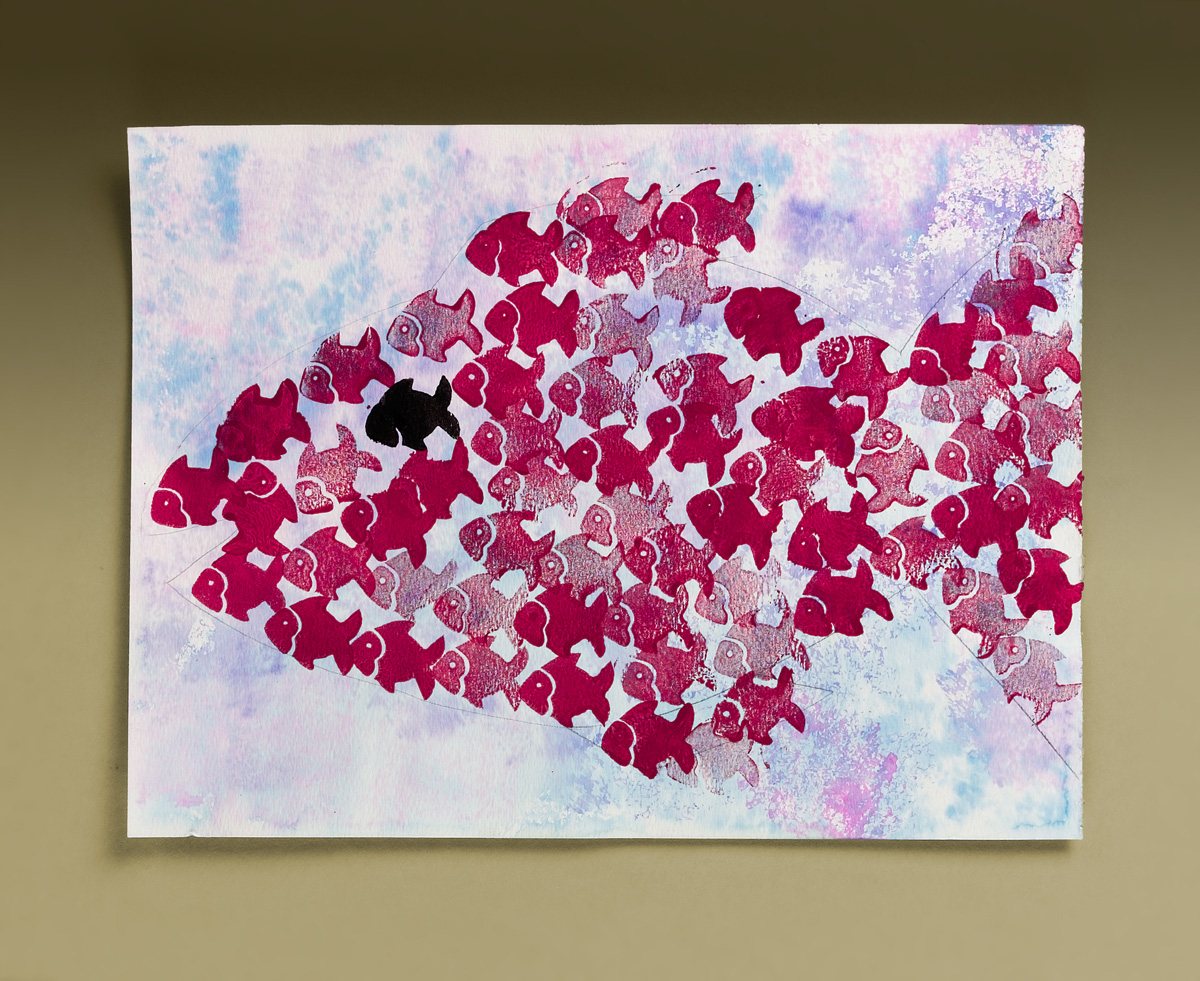 Have students identify how groups of various animals travel together. For example, geese fly in a V formation in order to reduce the wind resistance, thus conserving energy. And fish travel in schools to protect them from enemie, and it also helps them swim more efficiently. Ask students to investigate other animals that travel in packs or herds. Then ask them to choose one type to depict in a sponge painting.