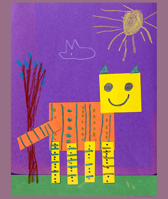 Have children create a spotted or striped animal using construction paper. They can use blunt tip scissors to cut rectangular strips of paper in various sizes that can be used to form the grass, the sky, the animal's legs, or something else they wish to add to a shape collage. They can cut or tear other shapes as circular, triangular, and oval parts for the body, head, ears, nose, etc. Ask them to draw the animal's stripes and/or spots. They can draw background items, such as plants, trees, the sun, etc.