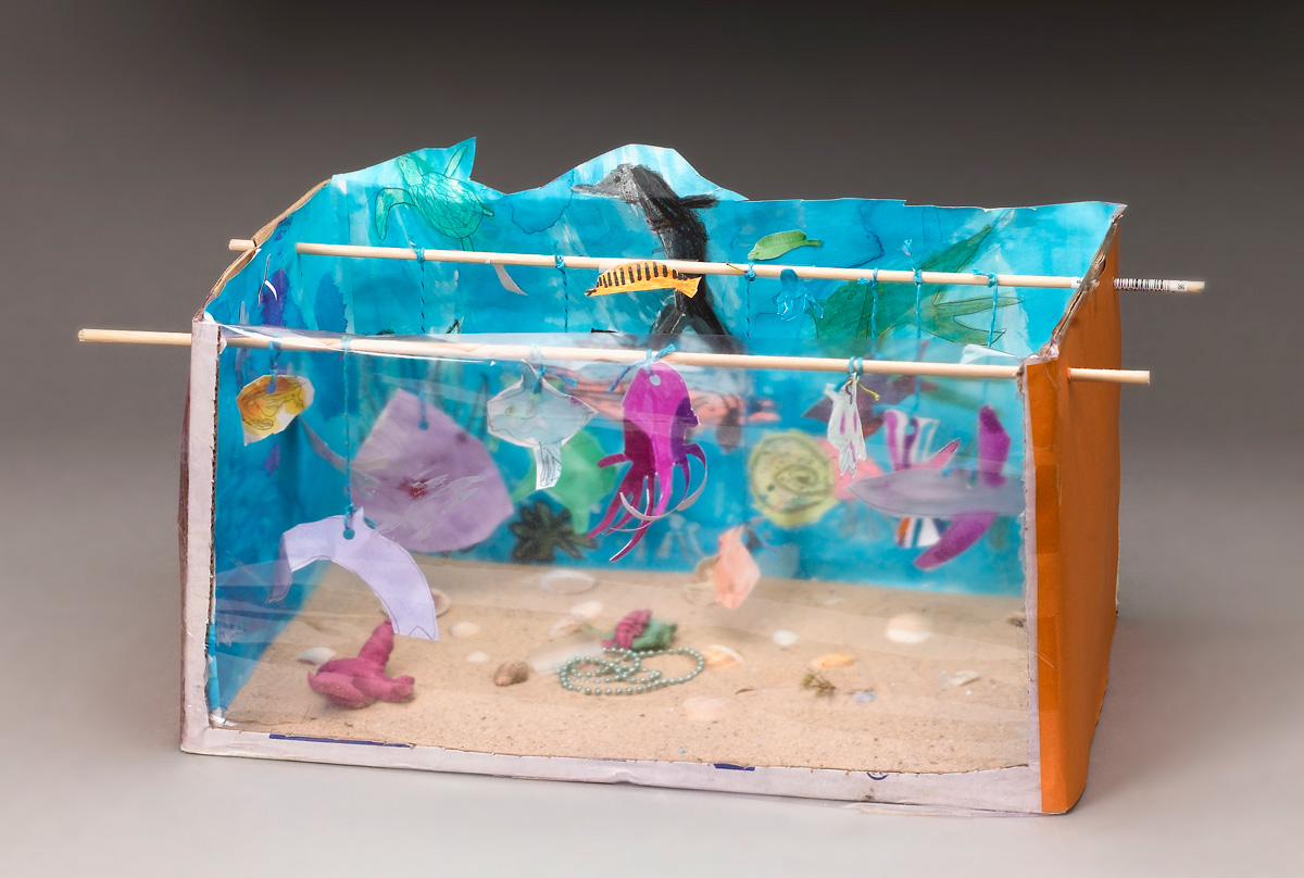 To create a watercolor-crayon resist for the diorama's background, have students press firmly with crayons and then paint over the scene with watercolors. The wax will resist the watercolors, so the fish and plants will look like they are in water.