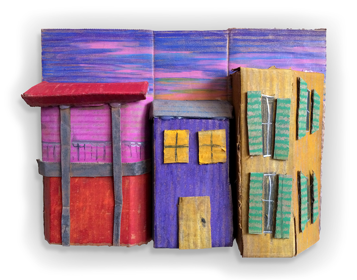 The students will assemble their shapes into a building and adorn it with design details. They may use scraps of cut boxes for windows, doors, and other embellishments. Then they'll place the building on a cardboard backdrop and color the structure's environment.