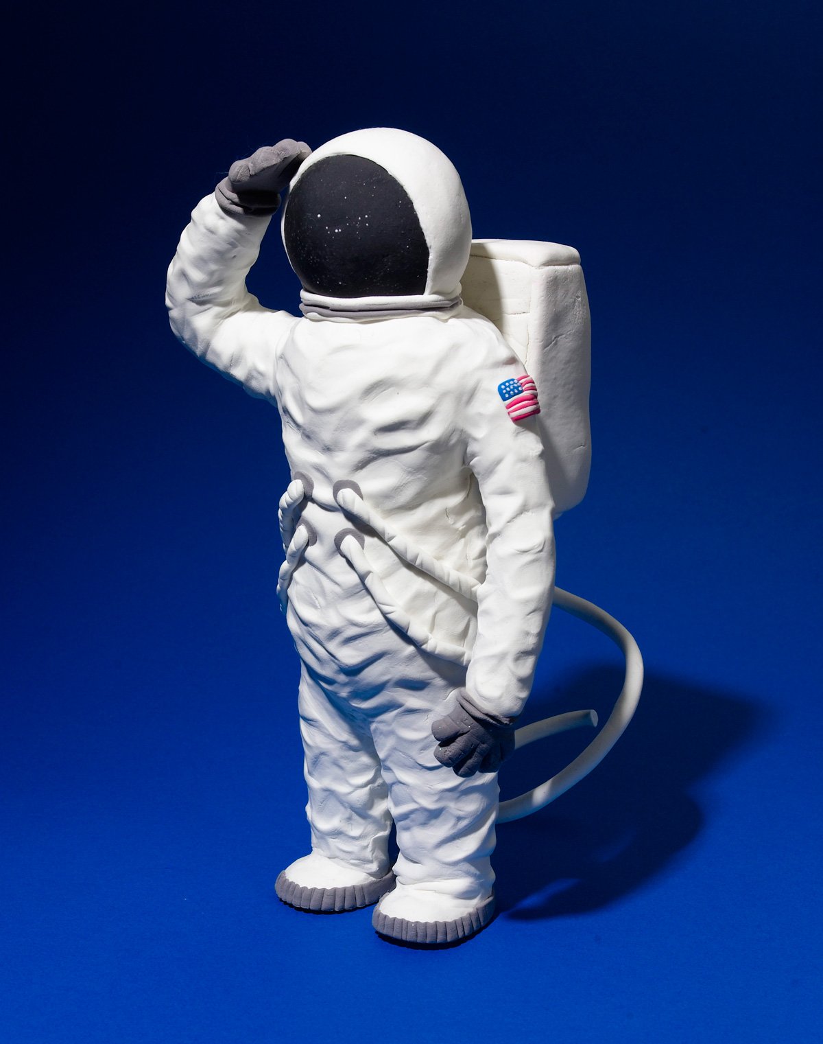 Have students create a replica of an astronaut in a flight suit. For the torso they can cover a cylindrical container with Model Magic, and for the backpack they can cover a small box, such as a snack-size box of raisins. To make the helmet they can cover a small ball-shaped armature with a thin layer of Model Magic. Flexible chenille sticks (also known as pipe cleaners) and rolled up pieces of aluminum foil can be covered with Model Magic for the hoses and limbs respectively. They can complete the outfit with added details such as a flag patch, gloves, and boots.