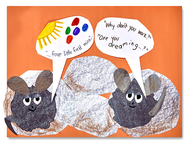 Have children form small groups and choose a scene from the book to depict in a collage. One student can draw and cut out shapes that will form the characters, another can decorate the background, etc. When the pieces are decorated and assembled the students can glue them onto the background paper. They will then write some questions that the characters might ask each other or that they would like to ask the characters who are in the scene.