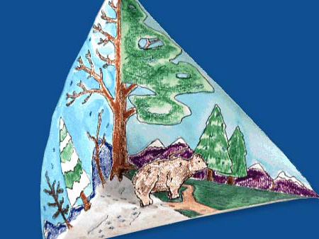 To create the triorama students will fold a square piece of heavy paper or a recycled file folder bringing opposite corners together to form a diagonal line. Then have them cut along one of the folds from the corner to the center. To form the triorama they will pull one flap back over the other. Have them note which area will be hidden from view when this is done. They should lay the drawing surface flat for ease of decorating the background of their triorama. When they are done they will take that one end of the flap and pull it behind the other flap and secure it with tape. Have them illustrate two different seasons on the left and right sides. They might, for example, put a tree in the middle that displays bare branches on the left and green leaves on the right. The base will also be divided in half so that the left side might show snow on the ground while the right side shows green grass. They can cut additional features, such as an animal, shrubbery, or anything else, out of heavy paper.