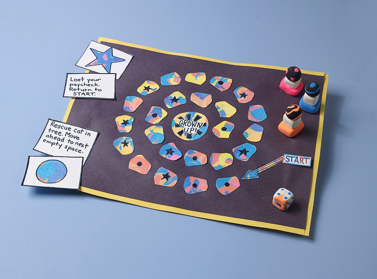 When the game's objectives and rules are established, have students design a game board on poster board and then embellish it with cut-outs or drawings. They can create the game pieces out of Model Magic and use plain paper to create cards.