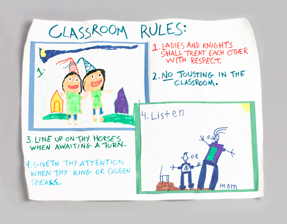 Ask students to form small groups and brainstorm a list of guidelines for the classroom. Then have each group illustrate a few points on their list. They might want to get playful and creative by imagining they live in a different era, such as the Renaissance or medieval times.