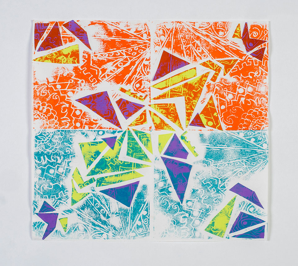 Collage, printmaking, and math converge to create a multitextured piece of artwork.
