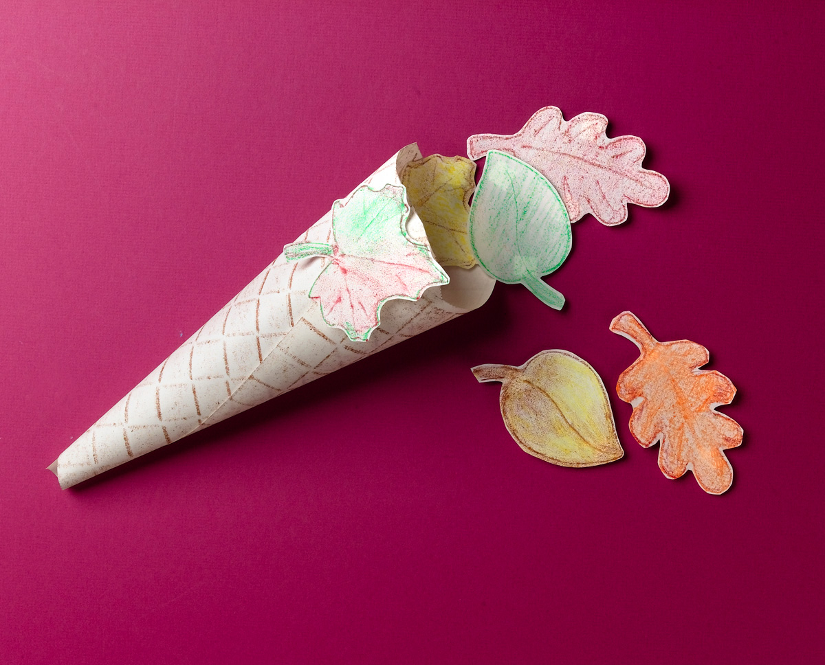Create a cornucopia - a horn-shaped container filled with seasonal flowers, leaves, produce, or anything you'd like - using patterns made by crayon rubbings.