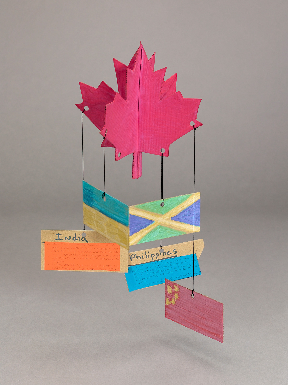 Have each group create a mobile that reflects the population of the city they chose. They should collaboratively pick a symbol that represents the city, such as the maple leaf shown here that represents Toronto. They might pick a cable car for San Francisco or the iconic opera house for Sydney.