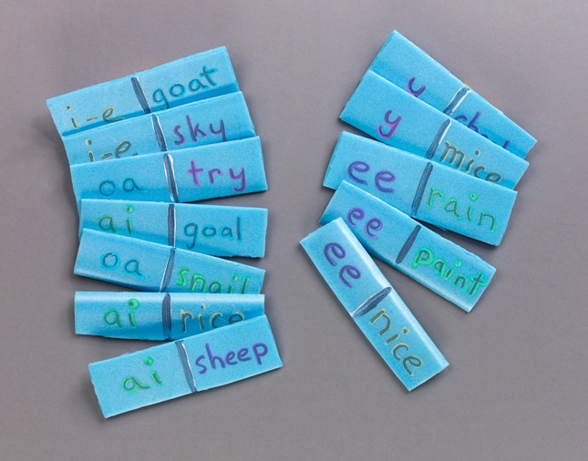 Have students create several dominos by cutting rectangles out of heavy paper. Draw a line down the center and write a word with a long vowel sound on one side. On the other side write a letter combo indicating a different long vowel sound.