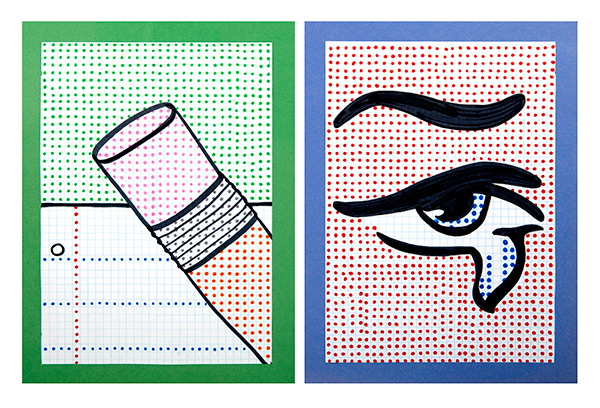Roy Lichtenstein was an American pop artist who was inspired by the art of the comic strip. Many of his works feature Ben Day dots, which is a technique of producing the effect of widespread color using only dots. It is named for the illustrator and printer Benjamin Henry Day Jr. who developed it in the late 1800s. Display images of Lichtenstein's art such as "Stepping Out," "Reverie," or "Sunrise," all of which display the Ben Day dot technique. Ask students to notice how it can appear that the background is colored in when in reality it is just composed of individual dots.