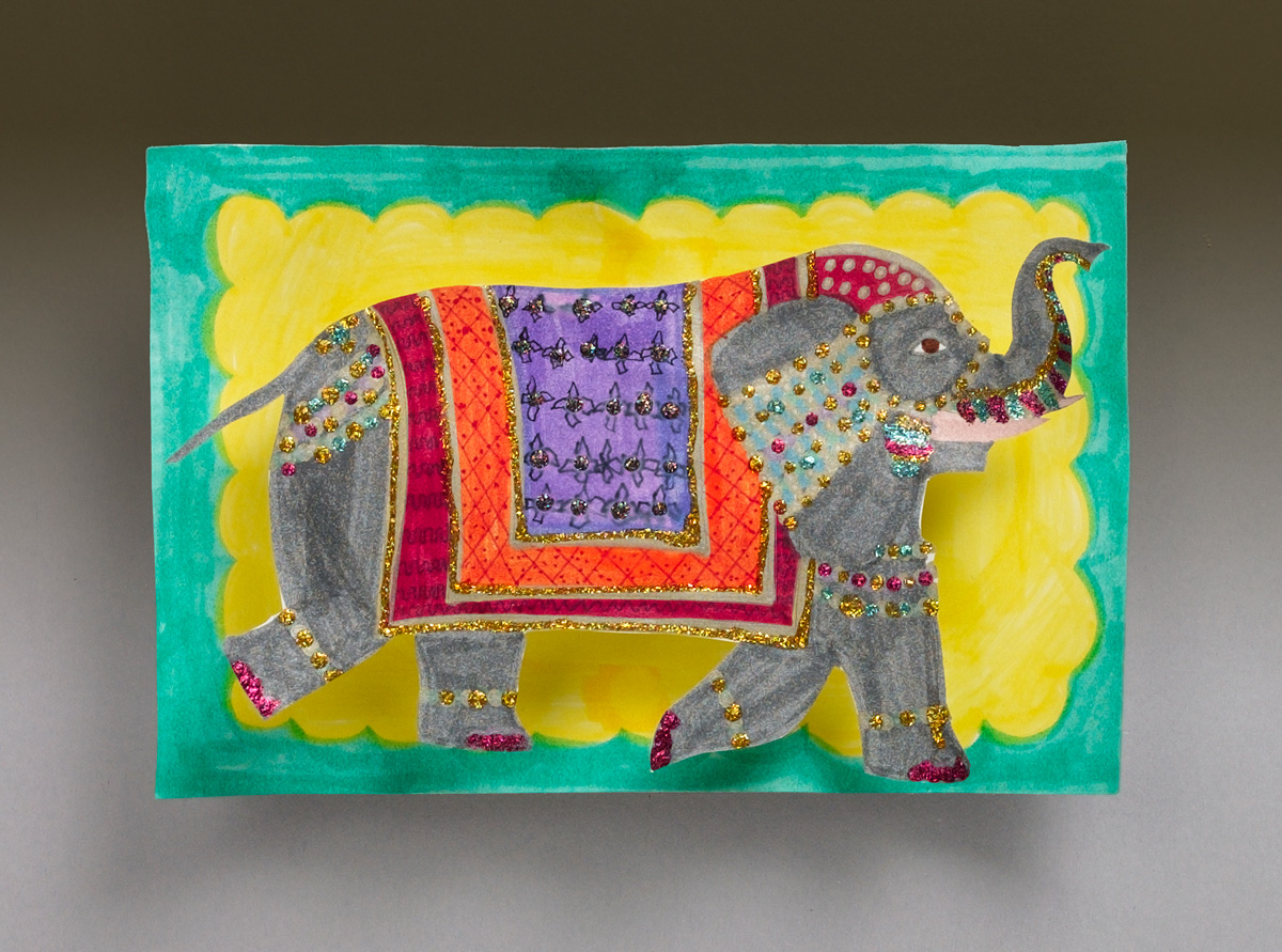 Ask students to look at images of some of the adorned elephants in these festivals. Let the images inspire a piece of artwork depicting an adorned elephant. They can draw an elephant on paper, cut it out, and decorate it with glitter glue. Then they can design a background on another piece of paper and attach the cut-out to the background.
