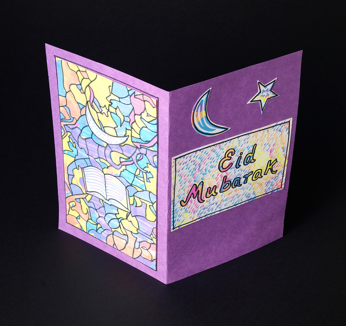 Have students fold a piece of paper and write a few words on the front of the card such as "Happy Birthday," "Happy Holidays," "I Appreciate You," or anything else. Then have them illustrate it using a technique that makes it look like stained glass, an artform that uses colored glass panels outlined with dark metal. To give their cards this look, they can outline sections of the image using a black fine-line marker, then color in the areas with colored pencils. Encourage them to choose symbols or a scene that would be meaningful to the recipient of the card or relevant to the special day. Then ask them to write a personal message on the inside. They may add more illustrations as well.