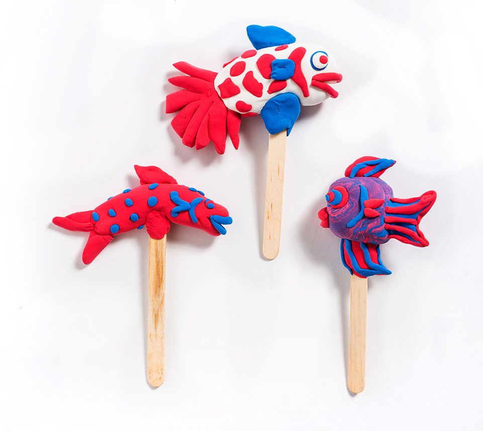 Ask children to create a fish stick puppet using familiar shapes. They can roll an oval shape of Model Magic for the body and then create features to attach to it. The fins can be triangles, the eyes can be circles, etc. While the Model Magic is still soft, have them insert a craft stick into the body.