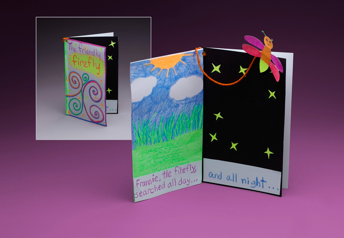To make the book students can fold several sheets of paper in half and bind them with a row of staples down the center fold. They can create a pop-out image of the story's main character, a firefly they might name. Students will use a separate piece of paper to design their colorful firefly, then cut it out. It can be attached to their book with a string that is glued or stapled to the top of the center fold.