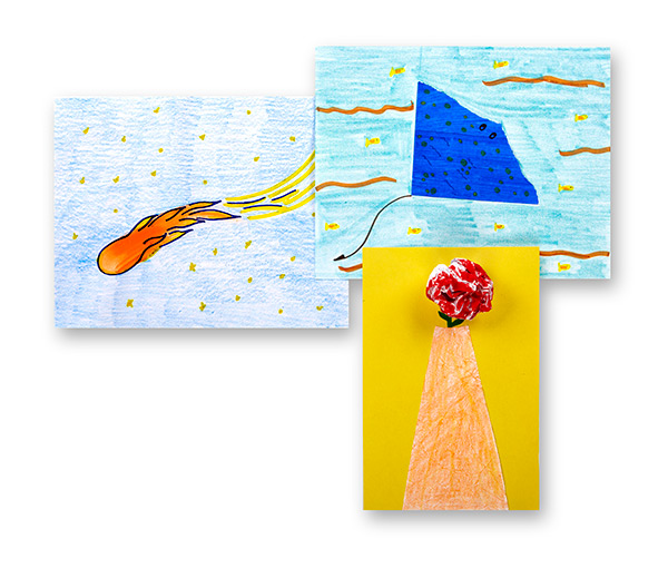 Students can embellish or extend the oops by making it part of a scene. They could cut out the mistake to reveal a new artistic layer beneath that image. Or they could even crumple up that paper and use it in a new way adding a 3D aspect to the scene. When done, have students present the art and talk about how they came up with the image they created. Have a class discussion about finding beauty in things that may have been discarded and what we can learn from embracing mistakes.