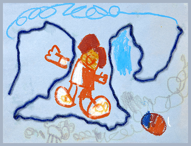 While the glue is drying, ask each child to compose a silly poem that would connect to their art. After the glue is dry, children will use crayons to add characters, objects, or scenery to their art, incorporating the yarn in interesting ways as part of their drawing. When they present their artwork they will also share their poem with the class.